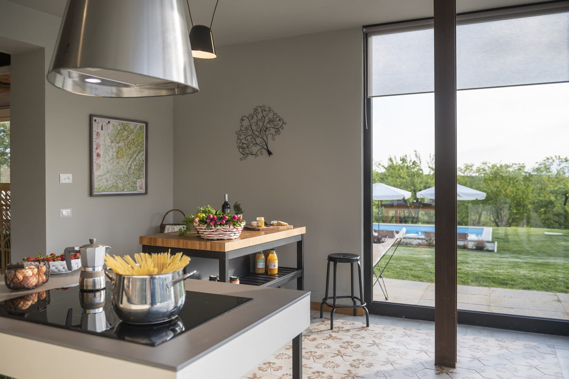 The outdoor areas of Casa San Grato, conceived as an inclusive space to engage guests of all ages with a wide variety of needs, extend a warm invitation to enjoy tranquil moments of peace and quiet, though equally susceptible to be a breeding ground of brilliant ideas. The little ones can enjoy a play area designed especially for them, complete with a slide; the more active guests have their own special space for storing bikes, a covered area for table tennis and table football; and food lovers can alternate between a wood-fired oven and a gas-fired barbecue to prepare delicacies. Every activity comes to life against a spellbinding hillside backdrop: the villa stands on a panoramic viewpoint that keeps the surrounding beauty forever in sight.