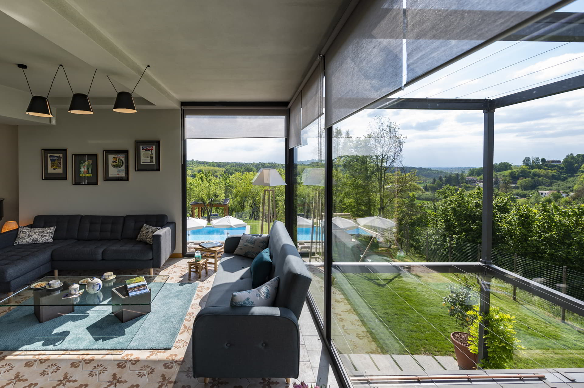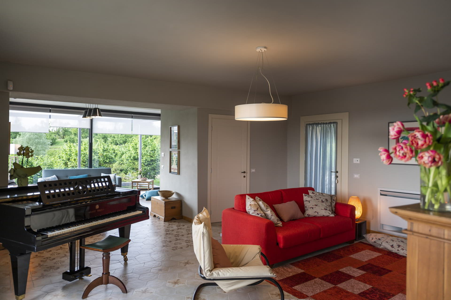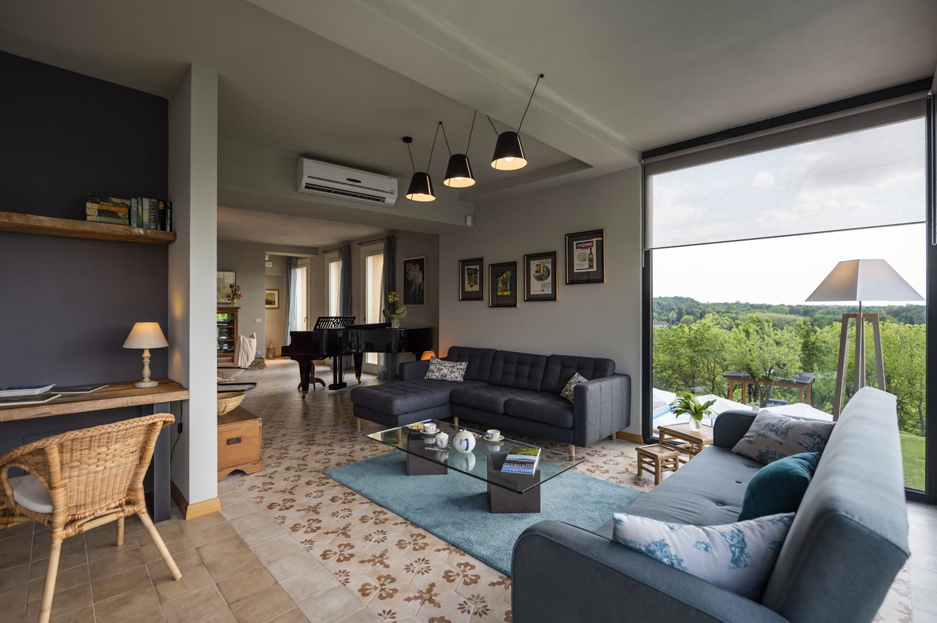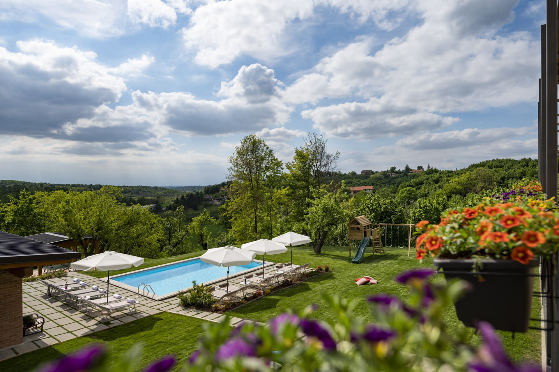 Waking to find yourself immersed in woodlands and vineyards, lazing by the pool while watching the children play, lying in the shade of an ancient chestnut tree with a good book, playing an easy game of table football or table tennis while pizzas bake in the wood-fired oven, or simply browsing your private selection of fine wines before dinner — the day unfolds with effortless pleasure. And if tired after exploring the countless trekking, cycle and mountain-bike paths in the surrounding area and feel like tasting a local truffle with a glass of Barbera, you simply head downstairs. Your perfect day isn’t over yet: there’s still time to sink into pure relaxation in the living room, carried away by the notes of the grand piano, and to savour the countryside’s quiet magic under twinkling stars.