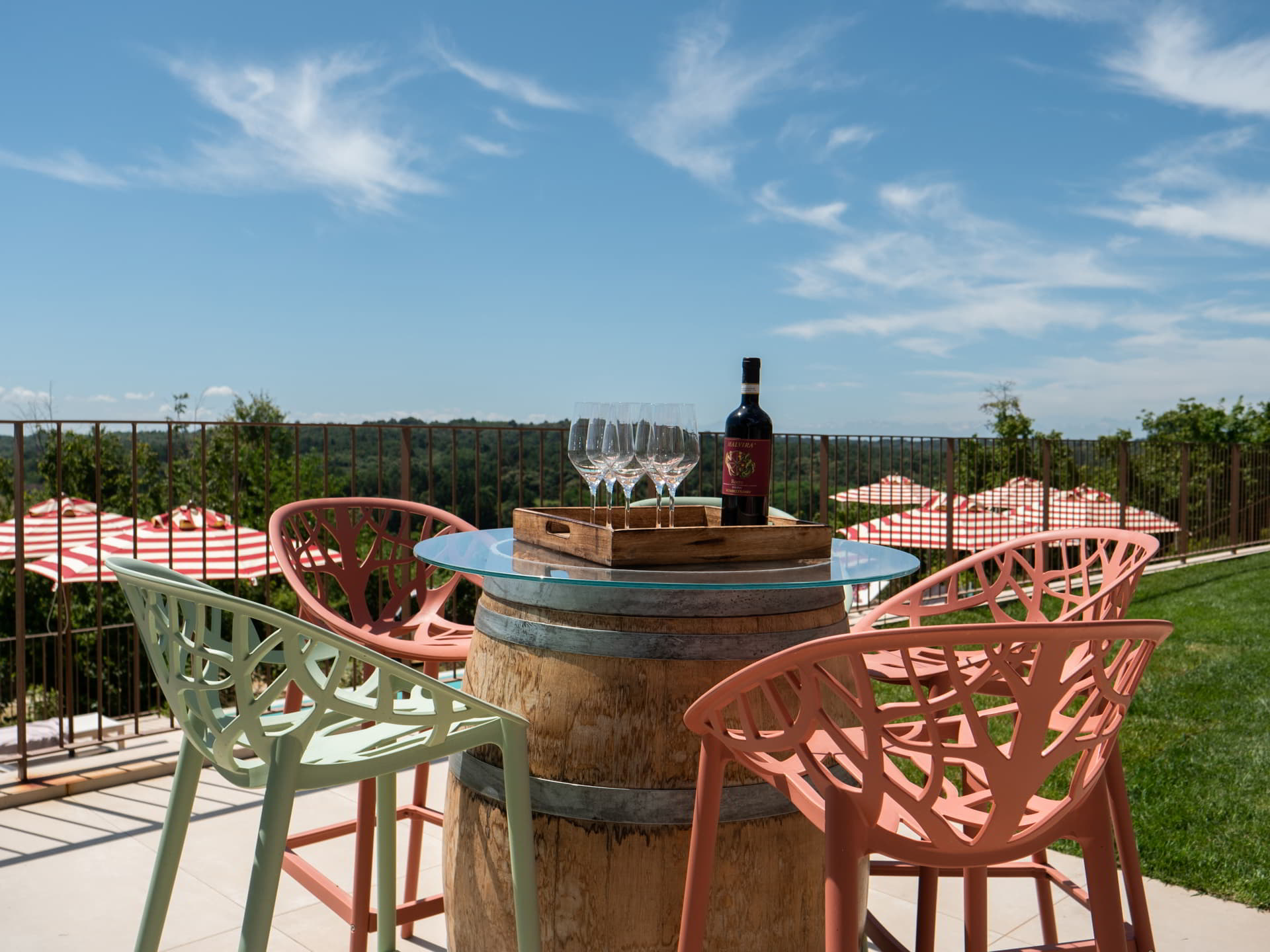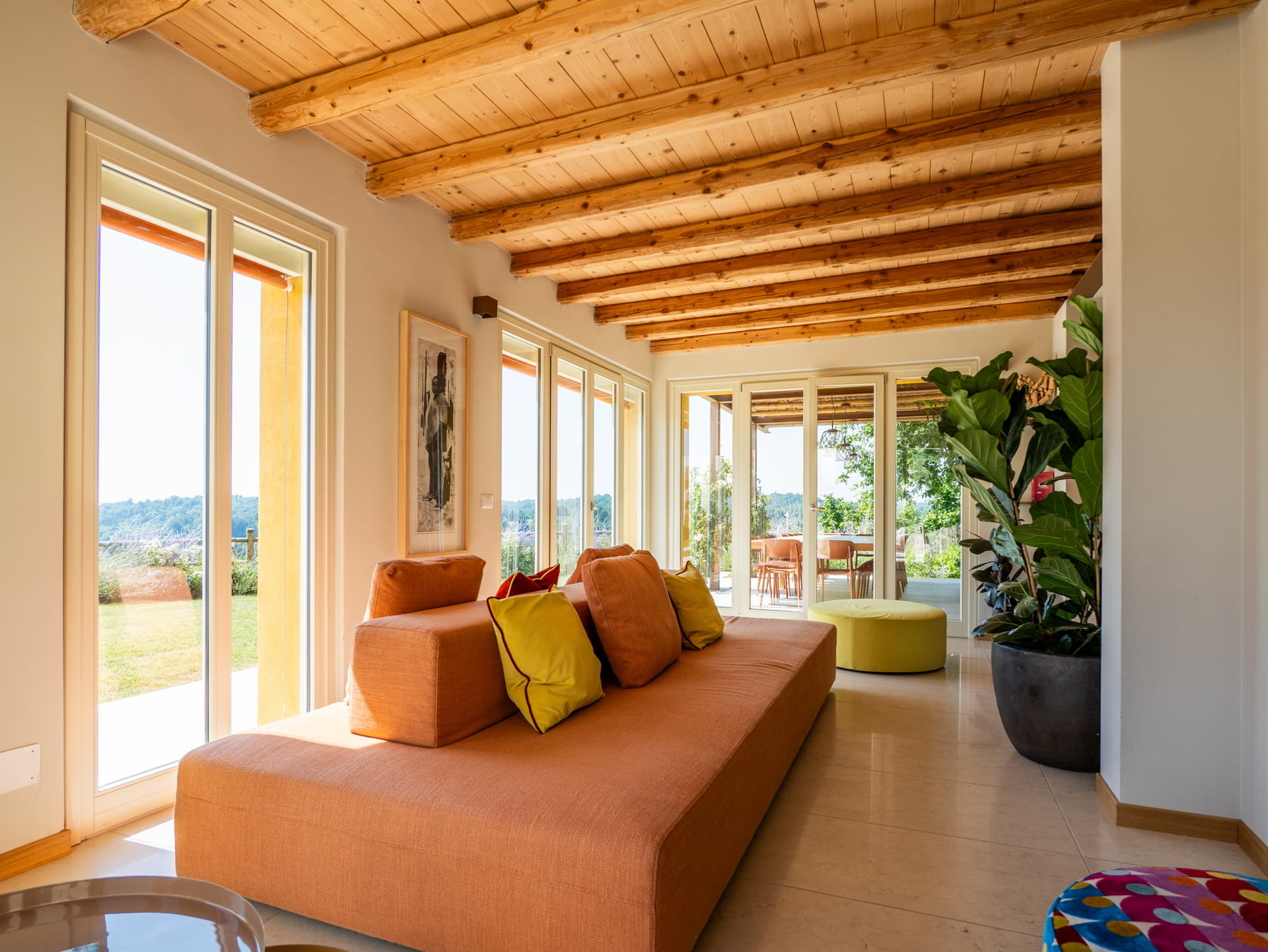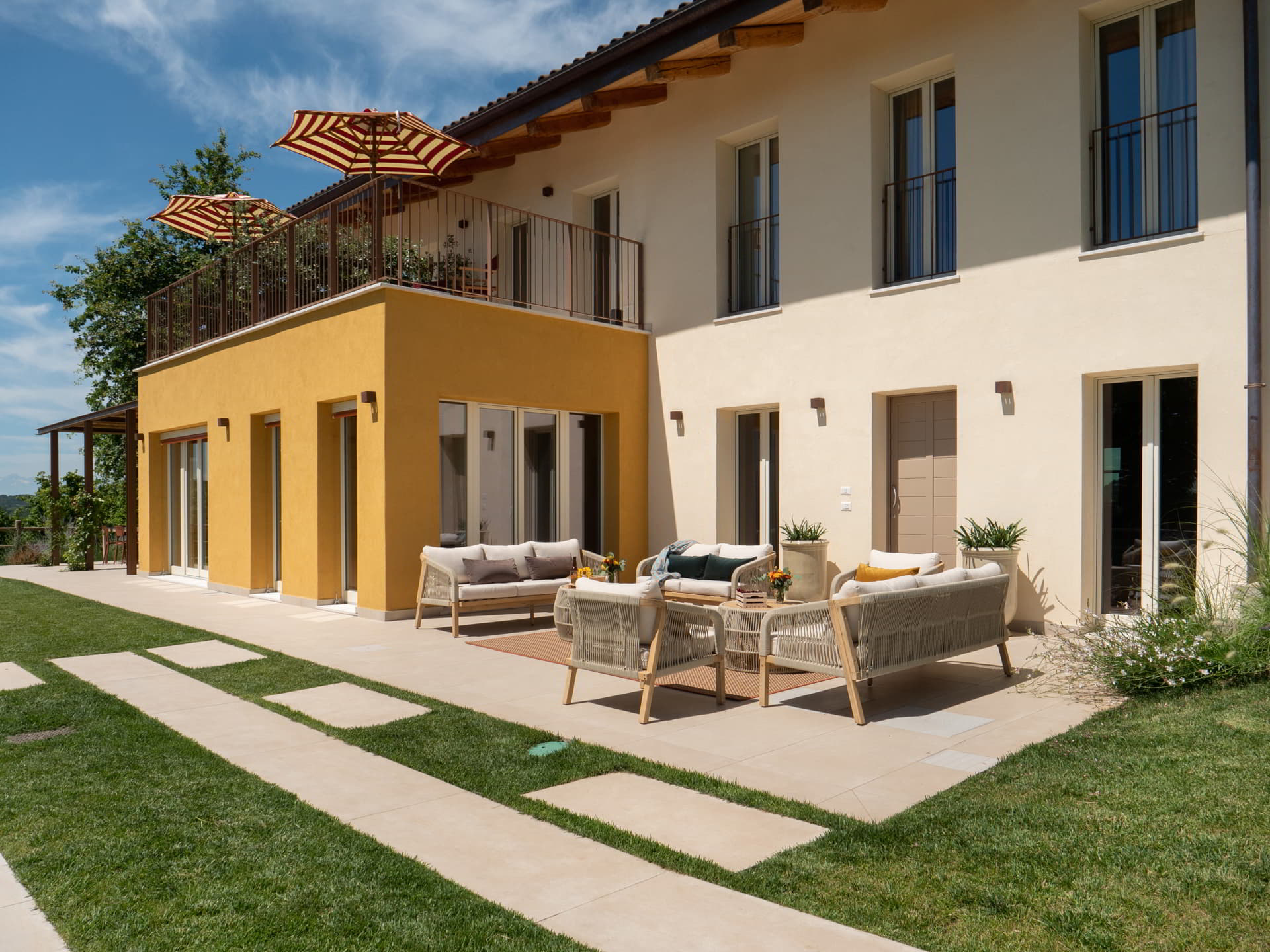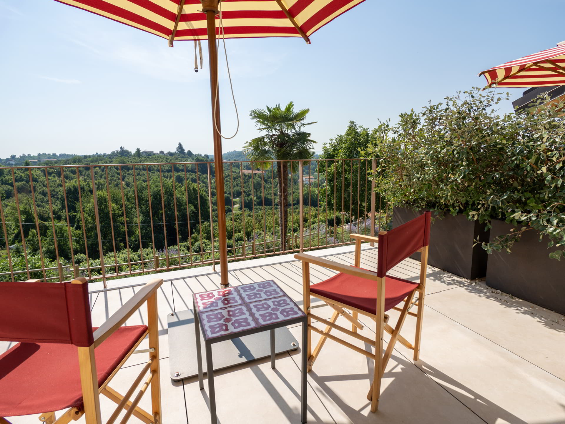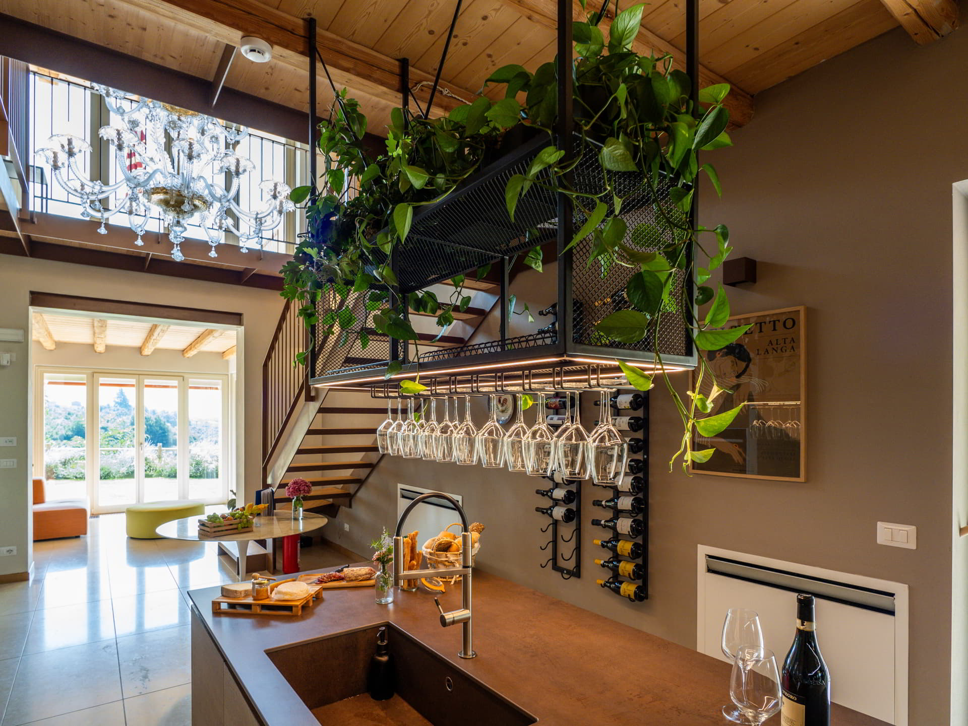 The atmosphere is intentionally sophisticated yet informal. Shaded woods and orderly vineyards flow seamlessly into the living room through wide windows, becoming part of the décor itself. And for those who wish to feel the world expand around them, the panoramic terrace offers a sweeping view where nature unveils its quiet majesty.